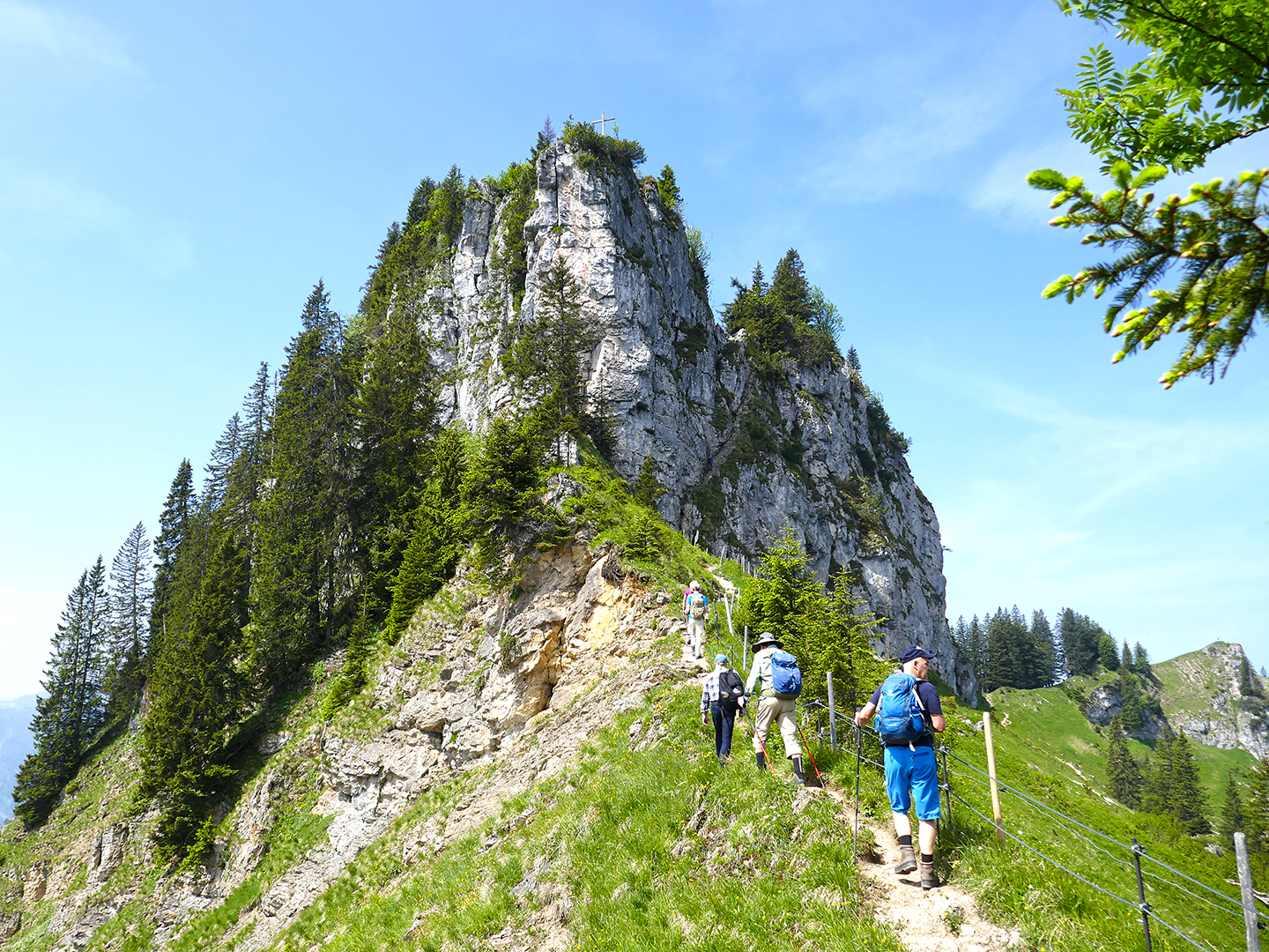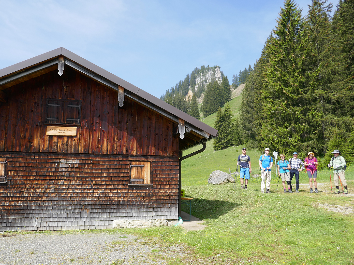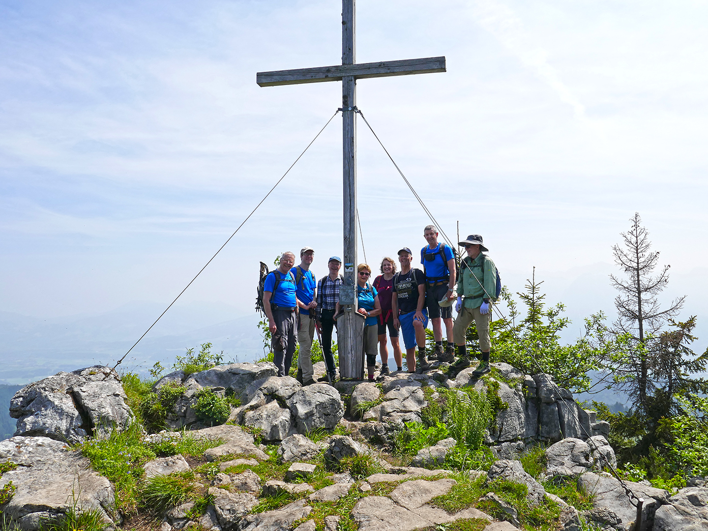 Die Rundtour begannen wir neben dem Parkplatz der Wannenkopfhütte am Riedbergpass. Nach Abstieg ins Tal der Schönberger Ach, erreichten wir nach kurzer Zeit die Herzbergalpe. Von dort wandten wir uns nach Osten, um bald die angenehme Kühle des Waldes zu erreichen. Der Wanderweg führte einfach hinauf zur Anhöhe und wir betraten dort das Almengelände an der Südostseite des Beslers. Dort erhofften wir den herrlicher Panoramablick über die Oberstdorfer Bergkette, der jedoch durch Verbrennungsstaub aus Kanada oder Saharastaub aus Afrika extrem getrübt war. Weiter ging es zur Oberen Gundalpe und von dort wieder zum Gratrücken hinauf. Die schroffen Felswände des Gipfelaufbaus wurden anschließend mit einer kurzen versicherten Passage gemeistert, die gleich darauf zum Gipfelkreuz führte. Die ausgewaschenen Kalkfelsen des Gipfelplateaus boten sich als komfortable Sitzplätze an. Nach der Brotzeit umrundeten wir den Beslergipfel, indem wir den Pfad auf der Südseite nahmen, um dann nach Westen zur Schönbergalpe abzusteigen. Leckere Kuchen und Getränke konnten wir dort bei sehr netten Mädels bestellen, was die abwechslungsreiche Tour abrundete.