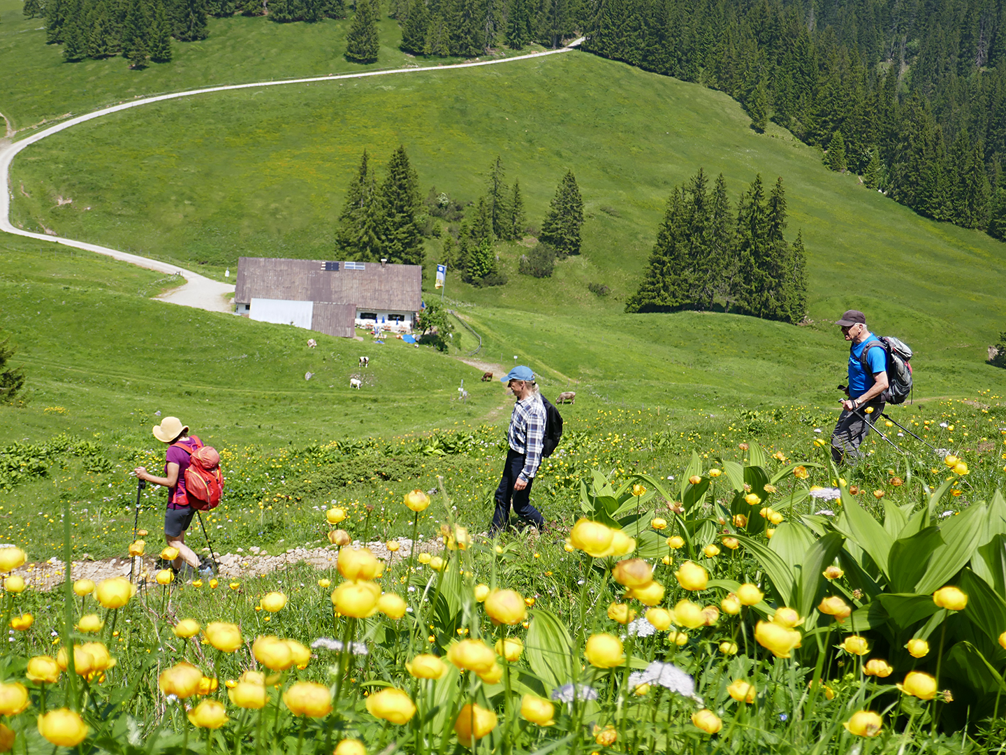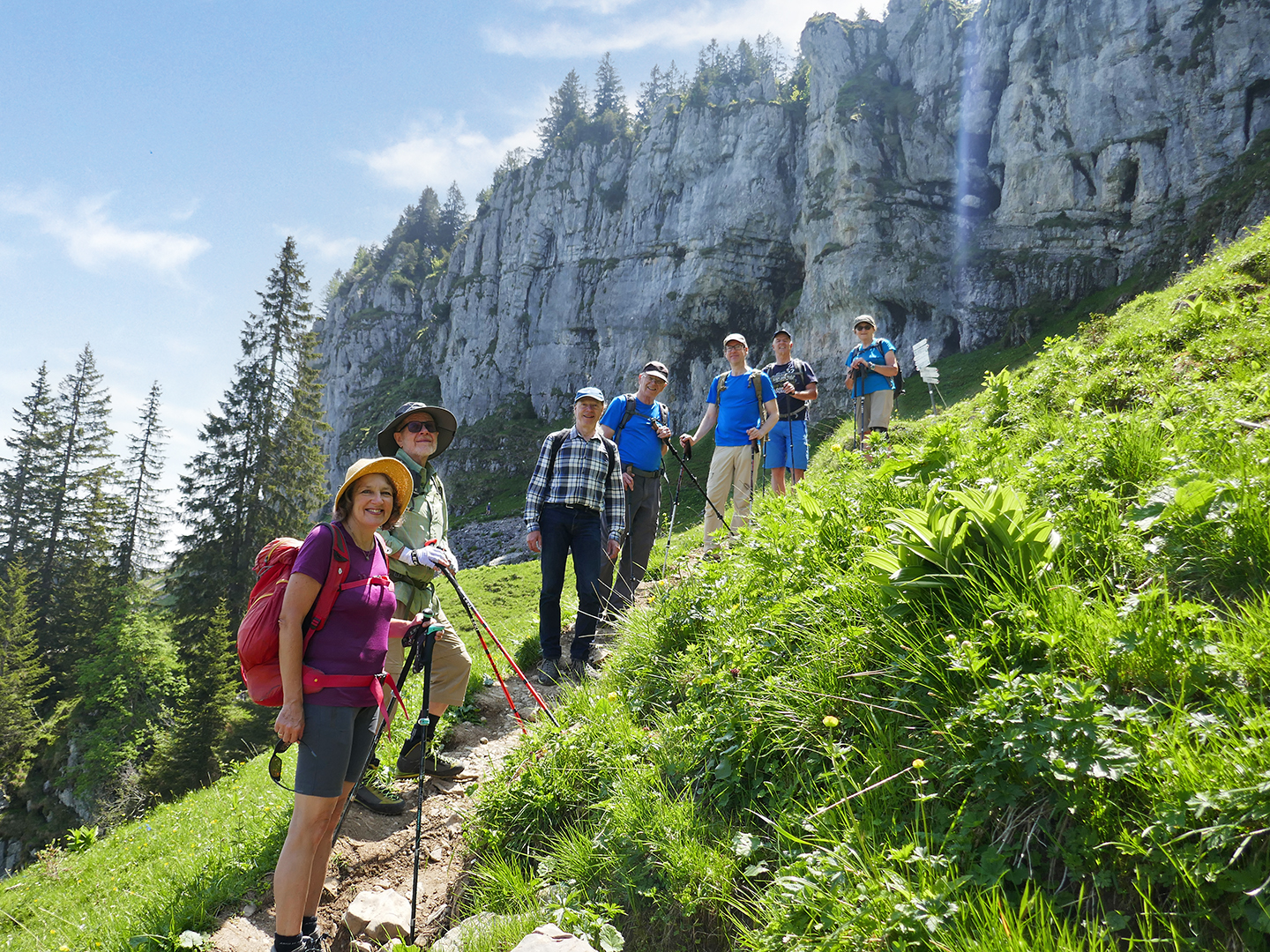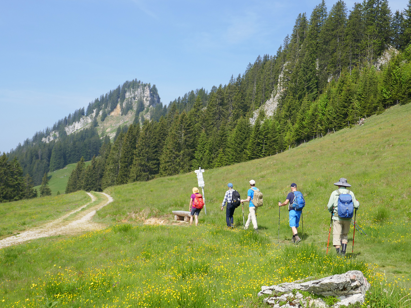 Die Rundtour begannen wir neben dem Parkplatz der Wannenkopfhütte am Riedbergpass. Nach Abstieg ins Tal der Schönberger Ach, erreichten wir nach kurzer Zeit die Herzbergalpe. Von dort wandten wir uns nach Osten, um bald die angenehme Kühle des Waldes zu erreichen. Der Wanderweg führte einfach hinauf zur Anhöhe und wir betraten dort das Almengelände an der Südostseite des Beslers. Dort erhofften wir den herrlicher Panoramablick über die Oberstdorfer Bergkette, der jedoch durch Verbrennungsstaub aus Kanada oder Saharastaub aus Afrika extrem getrübt war. Weiter ging es zur Oberen Gundalpe und von dort wieder zum Gratrücken hinauf. Die schroffen Felswände des Gipfelaufbaus wurden anschließend mit einer kurzen versicherten Passage gemeistert, die gleich darauf zum Gipfelkreuz führte. Die ausgewaschenen Kalkfelsen des Gipfelplateaus boten sich als komfortable Sitzplätze an. Nach der Brotzeit umrundeten wir den Beslergipfel, indem wir den Pfad auf der Südseite nahmen, um dann nach Westen zur Schönbergalpe abzusteigen. Leckere Kuchen und Getränke konnten wir dort bei sehr netten Mädels bestellen, was die abwechslungsreiche Tour abrundete.